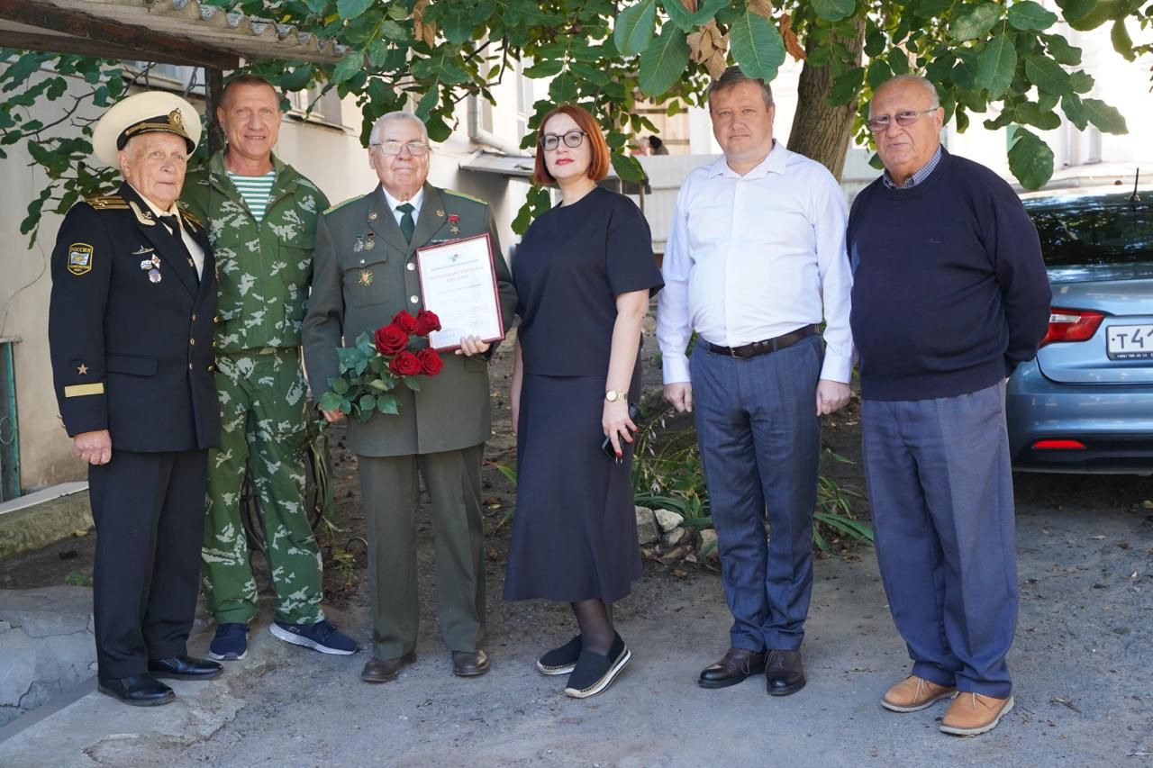 Заместитель главы Администрации города Таганрога по организационно-правовым и кадровым вопросам Екатерина Громыко вручила юбиляру Благодарственное письмо Администрации города Таганрога за плодотворную общественную деятельность, направленную на содействие патриотическому воспитанию.