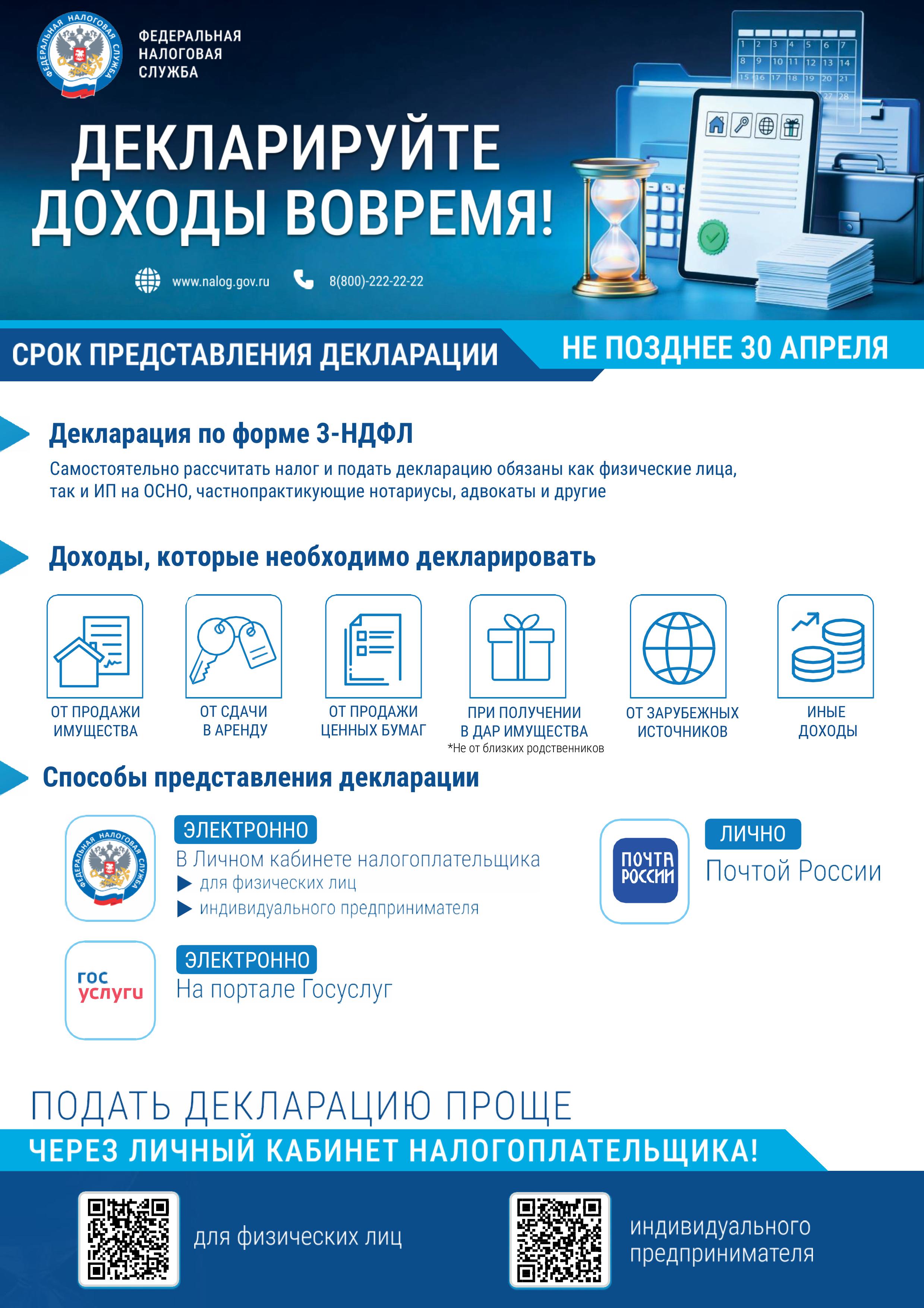 Инспекция Федеральной налоговой службы по г. Таганрогу Ростовской области информирует жителей города о том, что представить декларацию о полученных в 2025 году доходах физическим лицам необходимо до 30 апреля 2026 года.