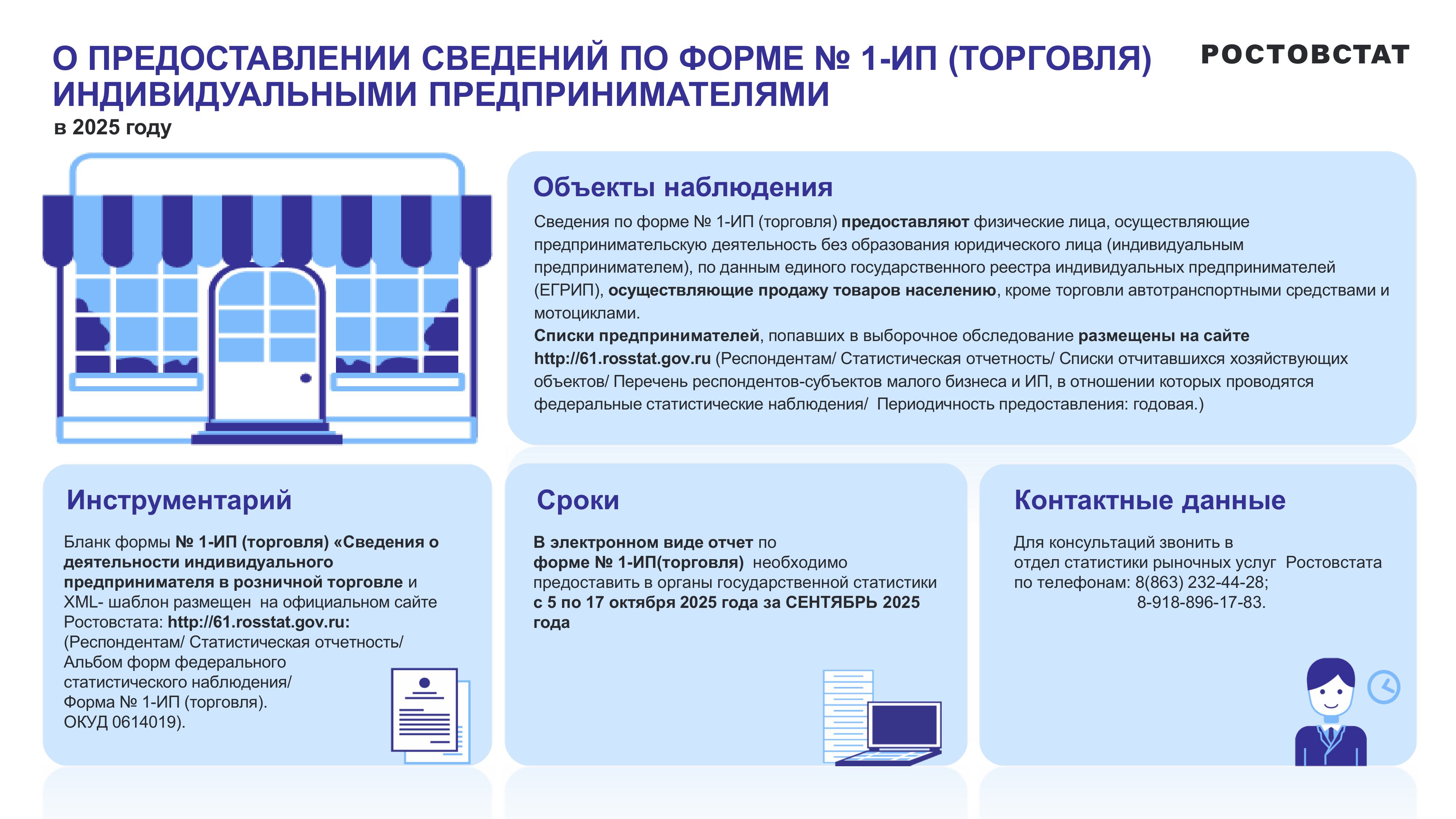 В соответствии с Федеральным законом от 29.11.2007 № 282-ФЗ «Об официальном статистическом учете и системе государственной статистики в Российской Федерации», Постановлением Правительства РФ от 18 августа 2008 года № 620 «Об условиях предоставления в обязательном порядке первичных статистических данных и административных данных субъектам официального статистического учета», Федерального Закона от 24 июля 2007 года № 209-ФЗ «О развитии малого и среднего предпринимательства в Российской Федерации» органы государственной статистики ежегодно проводят выборочное наблюдение за деятельностью индивидуальных предпринимателей в розничной торговле по форме федерального статистического наблюдения № 1- ИП (торговля) «Сведения о деятельности индивидуального предпринимателя в розничной торговле» за сентябрь текущего года с 5 по 17 октября отчетного периода.