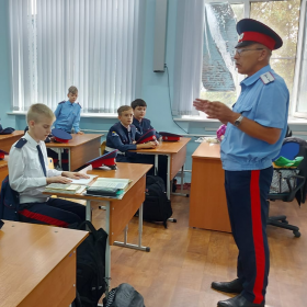 В первые дни сентября представители городского казачьего общества «Таганрогское» приняли участие в открытых уроках по профилактике терроризма в МОБУ СОШ №26, имеющей статус «казачье».