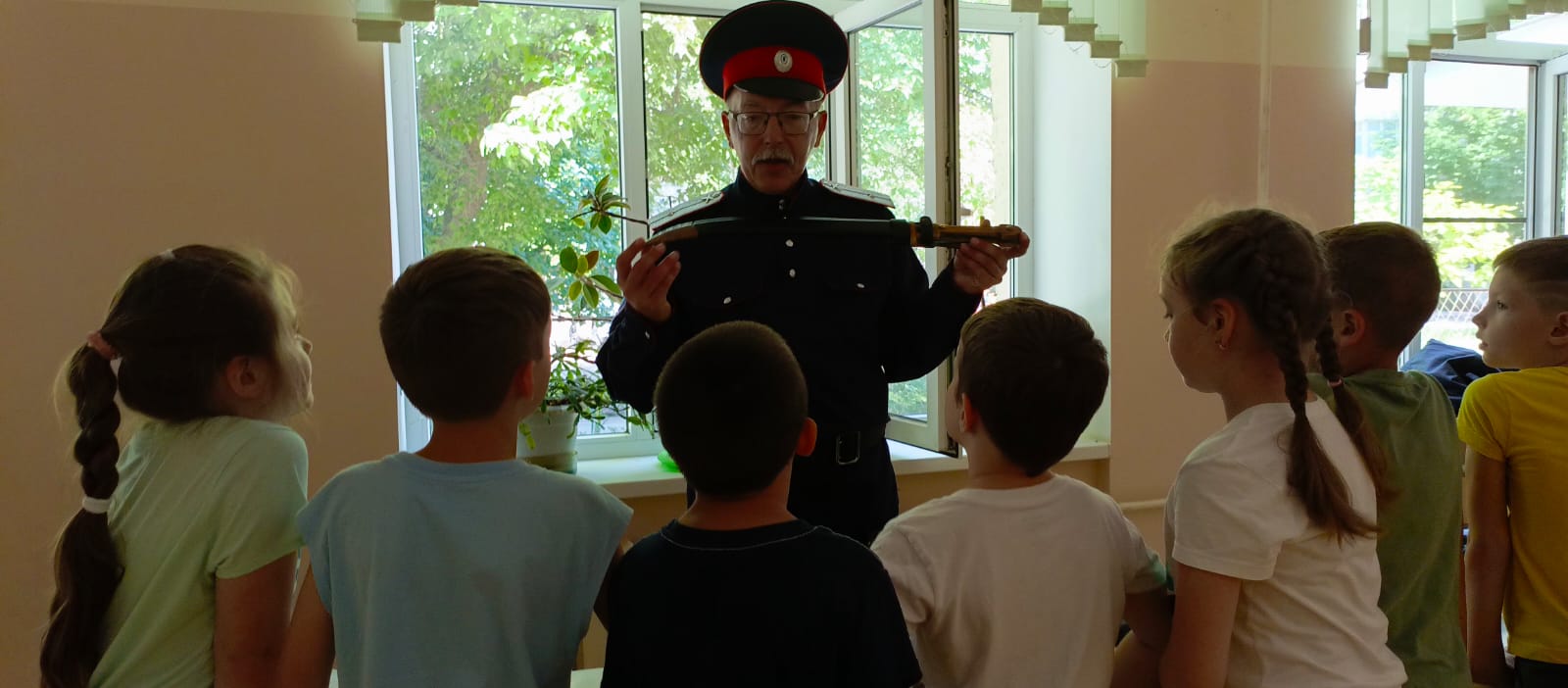 Казаки ГКО «Таганрогское» провели занятие для воспитанников пришкольного летнего лагеря МОБУ СОШ №5 и рассказали детям об истории донских казаков и их воинских традициях. Особое оживление у ребят вызвала возможность подержать в руках образцы современного вооружения и даже примерить на себе боевые доспехи, которые применялись казаками. Воспитанники пришкольного лагеря проявили живой и непосредственный интерес к рассказу казака-наставника, внимательно слушали его и задавали много вопросов.