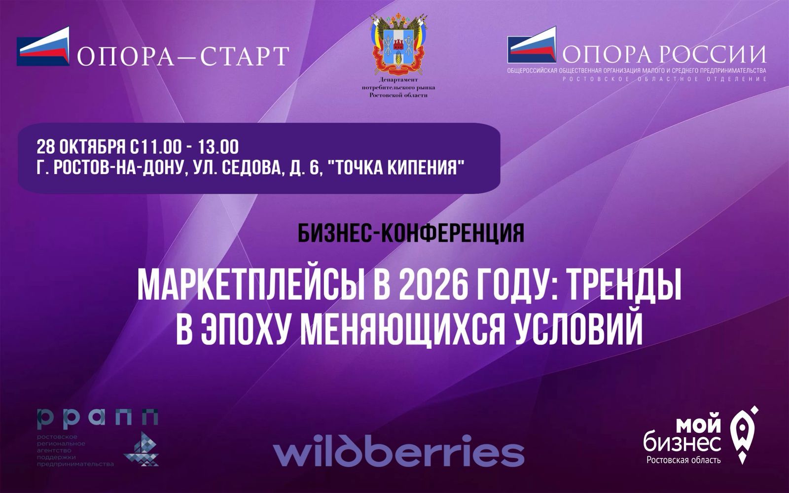 Управление экономического развития информирует о том, что 28 октября 2025 г. 11:00 – 13:00 в г. Ростов-на-Дону, ул. Седова, д. 6/3, Конференц-зал, 1 этаж состоится конференция «Маркетплейсы в 2026 году: тренды в условиях меняющихся условий».