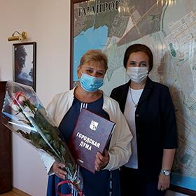Председатель Городской Думы – глава города Таганрога Инна Титаренко поздравила с юбилеем председателя местной национально-культурной автономии «Белорусы Таганрога» Элину Старикову, вручив ей Почетную грамоту Городской Думы.