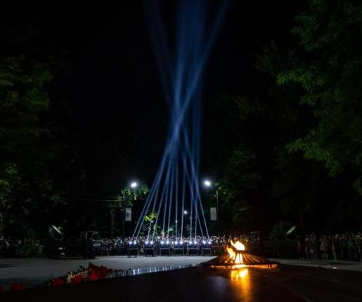 Таганрогский муниципальный духовой оркестр исполнил концерт памяти, участники акции почтили память погибших в годы Великой Отечественной войны минутой молчания и возложили цветы к Вечному огню. В завершении акции прожекторы, «Лучи Победы», озарили ночное небо над городом.