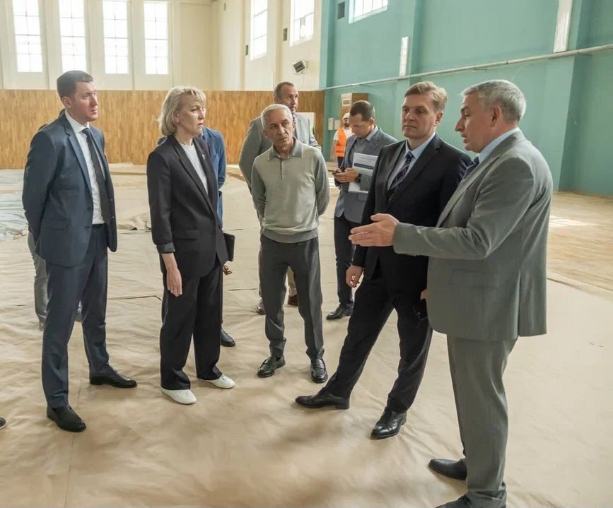 Следующим объектом для посещения стал Дворец спорта на улице Ленина, где завершается капитальный ремонт за счет средств областного бюджета. Сегодня строительная готовность составляет 80 %. Завершение ремонтных работ запланировано на август 2025 года.