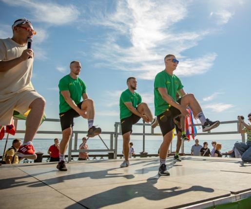 Все, кто проснулся сегодня рано и пришел на Пушкинскую набережную, делали утреннюю разминку вместе со знаменитостями: чемпионом олимпийских игр Вартересом Самургашевым, чемпионом Паралимпийских игр Александром Скалиухом, двукратным призером Паралимпийских игр Евгением Зиминым и актером театра и кино Павлом Деревянко.