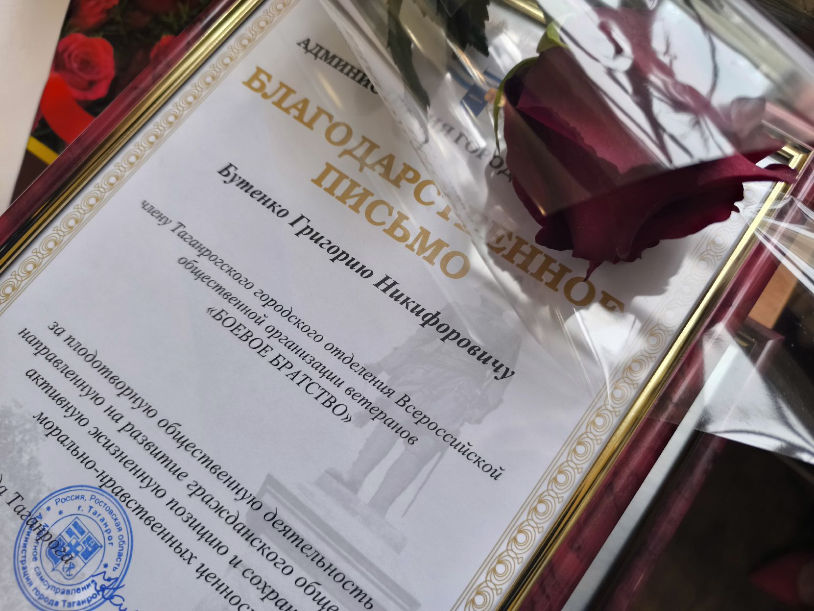 В рамках мероприятия особое внимание было уделено ветерану труда Ростовской области, члену Таганрогского отделения Всероссийской общественной организации ветеранов «Боевое братство» и региональной общественной организации «Союз десантников Таганрога», ветерану Воздушно-десантных войск Григорию Никифоровичу Бутенко, который накануне отметил свой 95-летний юбилей. Несмотря на преклонный возраст, Григорий Никифорович продолжает оставаться активным и жизнелюбивым, являясь примером стойкости и мужества для молодого поколения.