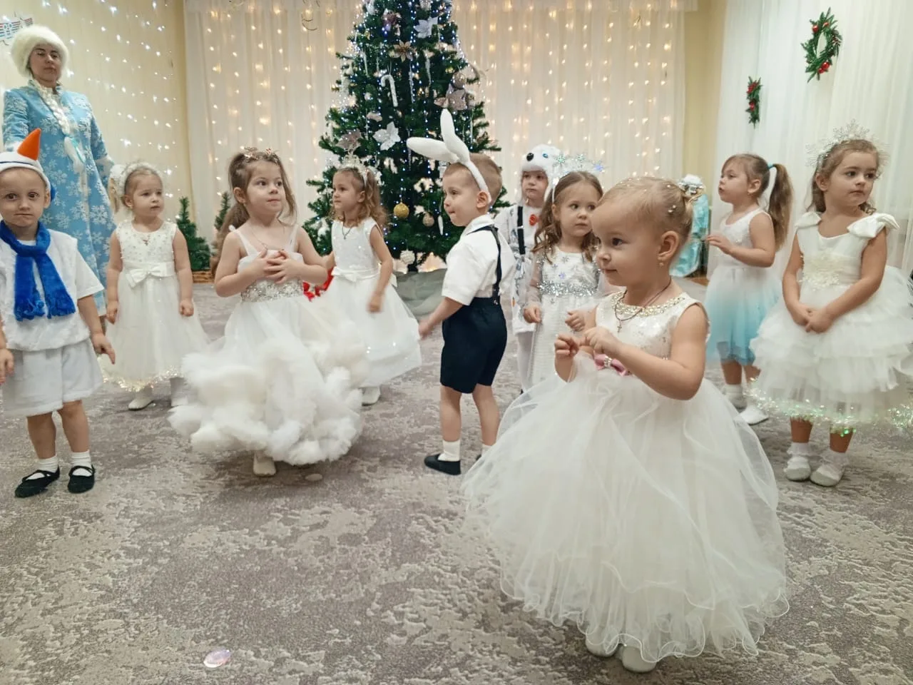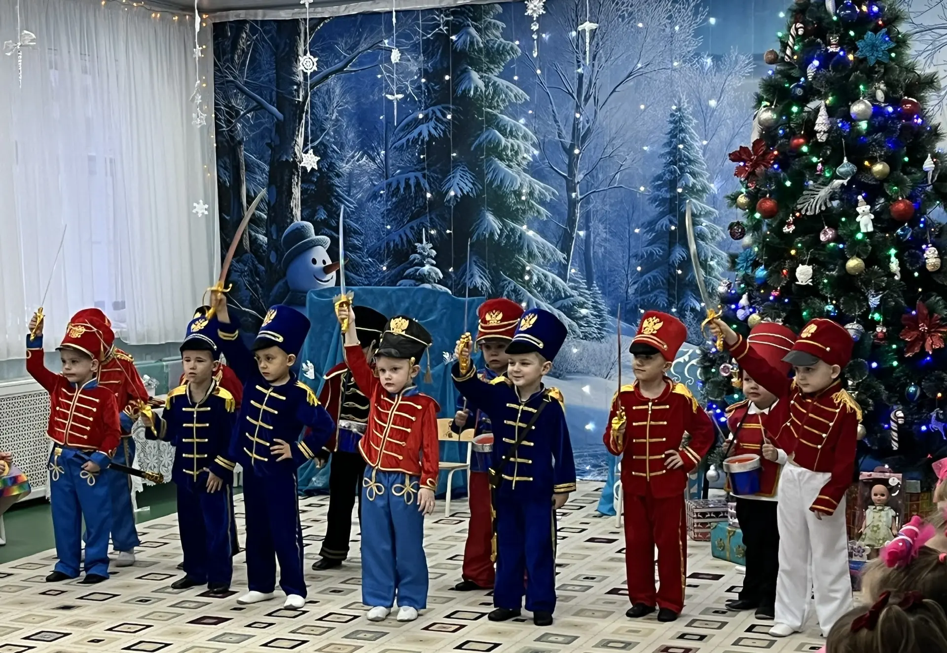 Дошкольники в красочных костюмах участвуют в праздничных представлениях, поют песни, читают стихи и водят хороводы вокруг ёлки, погружаясь в волшебный мир новогоднего чуда.