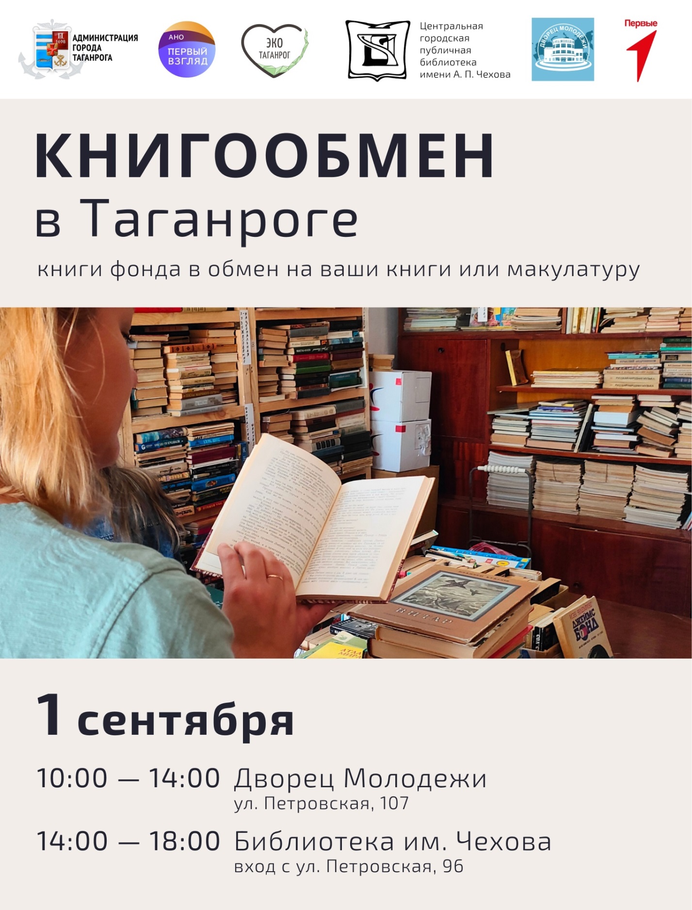 АНО «Первый взгляд» совместно с Администрацией и Молодежным правительством города Таганрога в рамках реализации программы экологизации Таганрога, ставшей победителем конкурса на предоставление субсидии из бюджета города на реализацию общественно значимых (социальных) программ в 2024 году, в День знаний проведет акцию по популяризации чтения бумажных книг и сдачи макулатуры «Книгообмен в Таганроге».