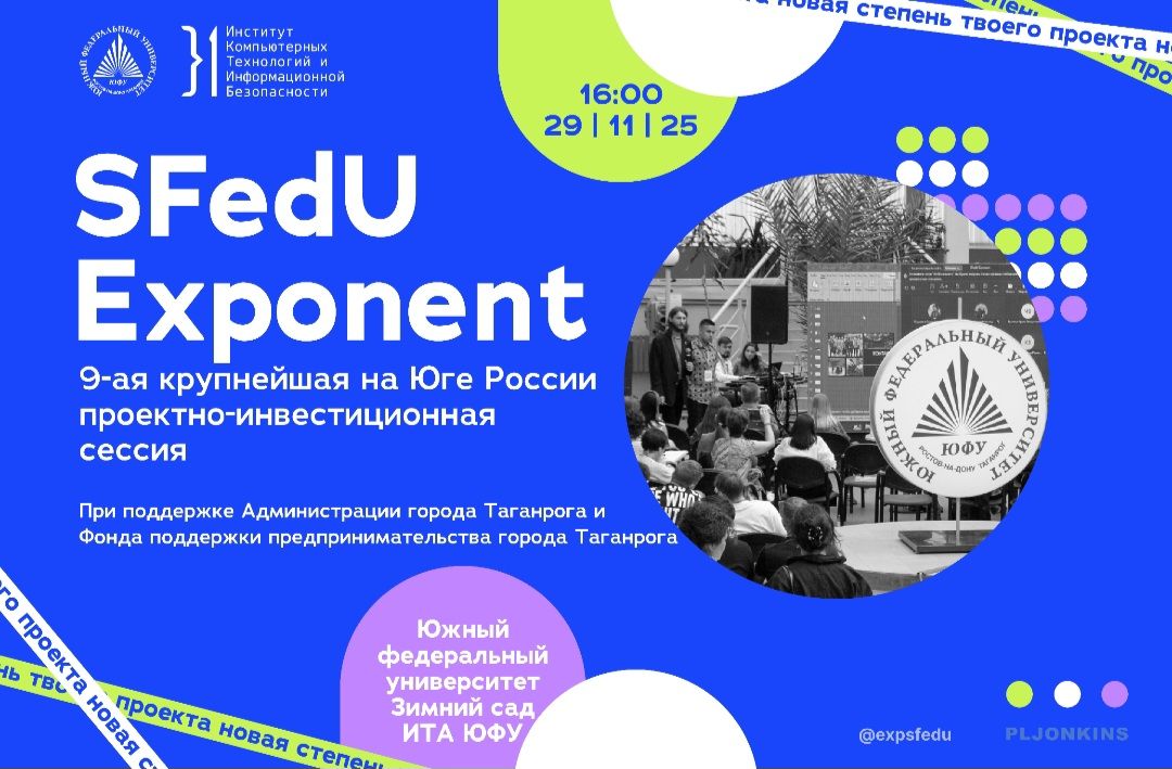 29 ноября, при поддержке Администрации города Таганрога и НО МКК «Фонд поддержки предпринимательства города Таганрога», в Инженерно-технологической академии Южного федерального университета состоится традиционная проектно-инвестиционная сессия SFedU Exponent – exp(sfedu).