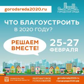 С 25 по 27 февраля в городах и районах Ростовской области пройдет рейтинговое голосование по выбору территорий для благоустройства. Это реальный шанс повлиять на выбор общественного пространства, которое станет лучше уже в 2020 году.